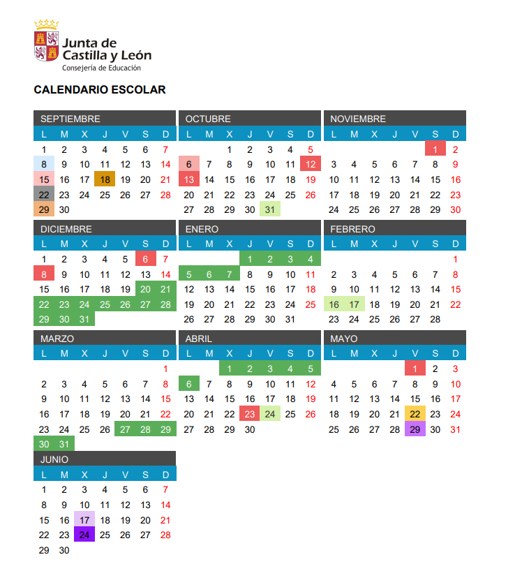 Además del calendario escolar de Castilla y León, hay que tener en cuenta la fiesta local de Torrecaballeros (día no lectivo):